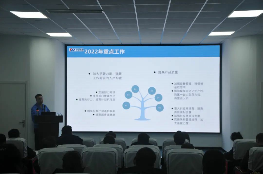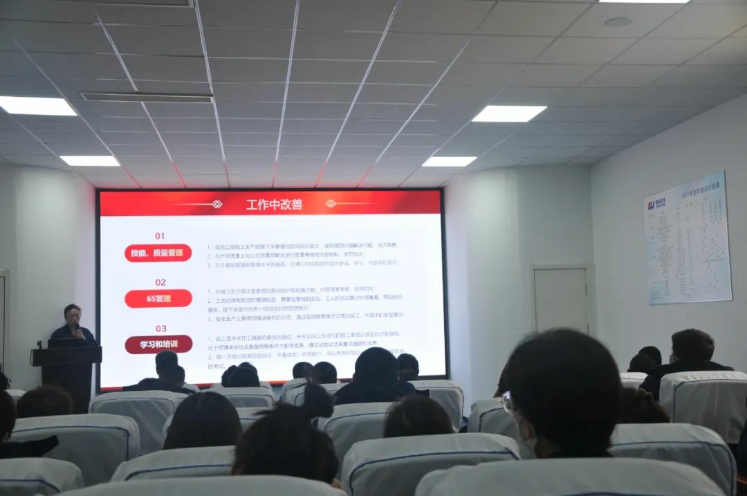 生產(chǎn)部部長從“去年工作回顧”“取得工作成果”“工作不足改善”“新年工作計劃”四個方面出發(fā),對2021的全年工作情況進行了總結概述,匯報了本年度生產(chǎn)任務的完成情況,重點強調(diào)了安全生產(chǎn)管理,提出要時刻做到“警鐘長鳴”,認真執(zhí)行安全操作管理規(guī)定,落實安全培訓,讓安全意識深入人心;展示了2021年各方面工作取得的成果,同時指出了工作中存在的不足及改善措施,并提出了相關建議,制定了2022年的工作目標。